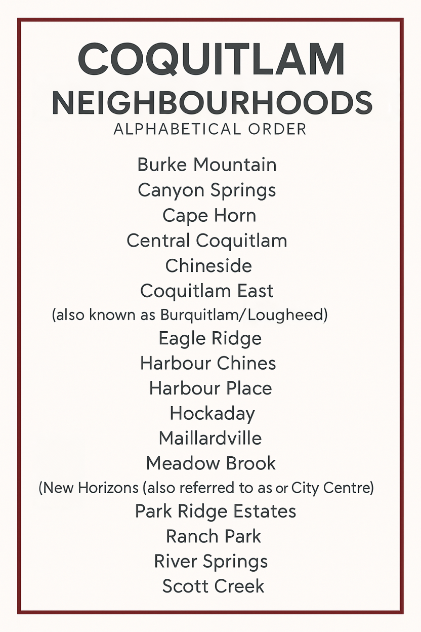 Austin Heights |Burke Mountain|Canyon Springs |Cape Horn |Central Coquitlam |Chineside |Coquitlam West |Eagle Ridge |Harbour Chines|Harbour Place |Hockaday | Nestor |Lower Hyde Creek |Maillardville |Meadow Brooks |New Horizons |North Coquitlam |Park Ridge Estates |Partington Creek |Ranch Park |River Heights |River Springs |Scott Creek |Smilling Creek |Summit View |Town Centre |Upper Eagle Ridge |Upper Hyde Creek |Westwood Plateau |Westwood Summit